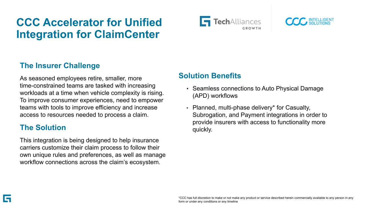 The CCC Accelerator for Unified Integration for ClaimCenter is designed to integrate CCC’s product capabilities across auto and casualty claim servicing functions with Guidewire ClaimCenter Cloud to simplify operations from claim creation to claim resolution.