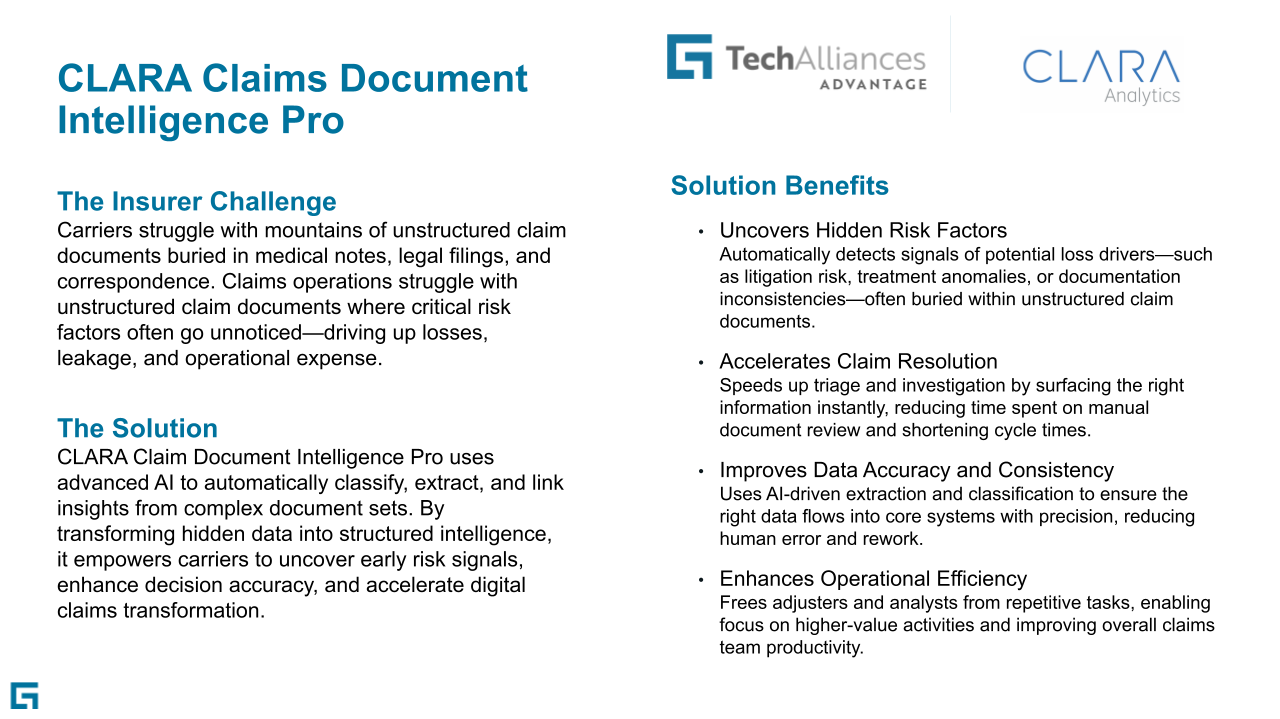 AI-powered document intelligence for P&C claims that classifies, extracts, and links unstructured content to claim data—streamlining workflows, improving accuracy, and accelerating claim resolution.