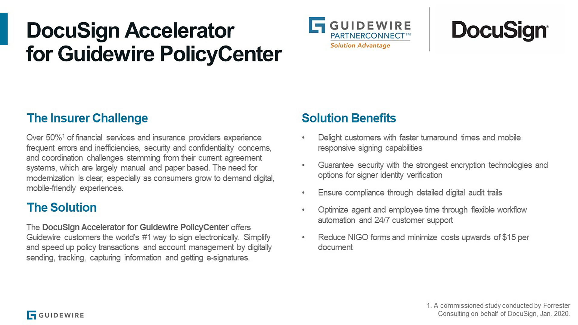 The Docusign Accelerator for PolicyCenter empowers policyholders to securely sign documents from any device, anywhere, at any time. As the top-rated mobile app, Docusign’s e-signature solution enhances user experience with responsive capabilities and faster turn-around times.