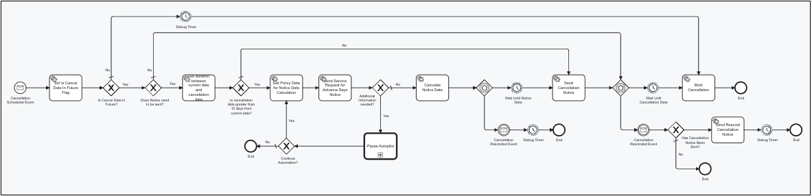 The Non-Payment Policy Cancellation Workflow Template automates the non-payment policy cancellation process across Guidewire PolicyCenter and BillingCenter. The workflow template replaces the OOTB integration between PolicyCenter and BillingCenter for the Begin Cancellation and Rescind Cancellation transactions. It also replaces the OOTB PolicyCenter CompleteCancellation workflow, as the template provides enhanced functionality.