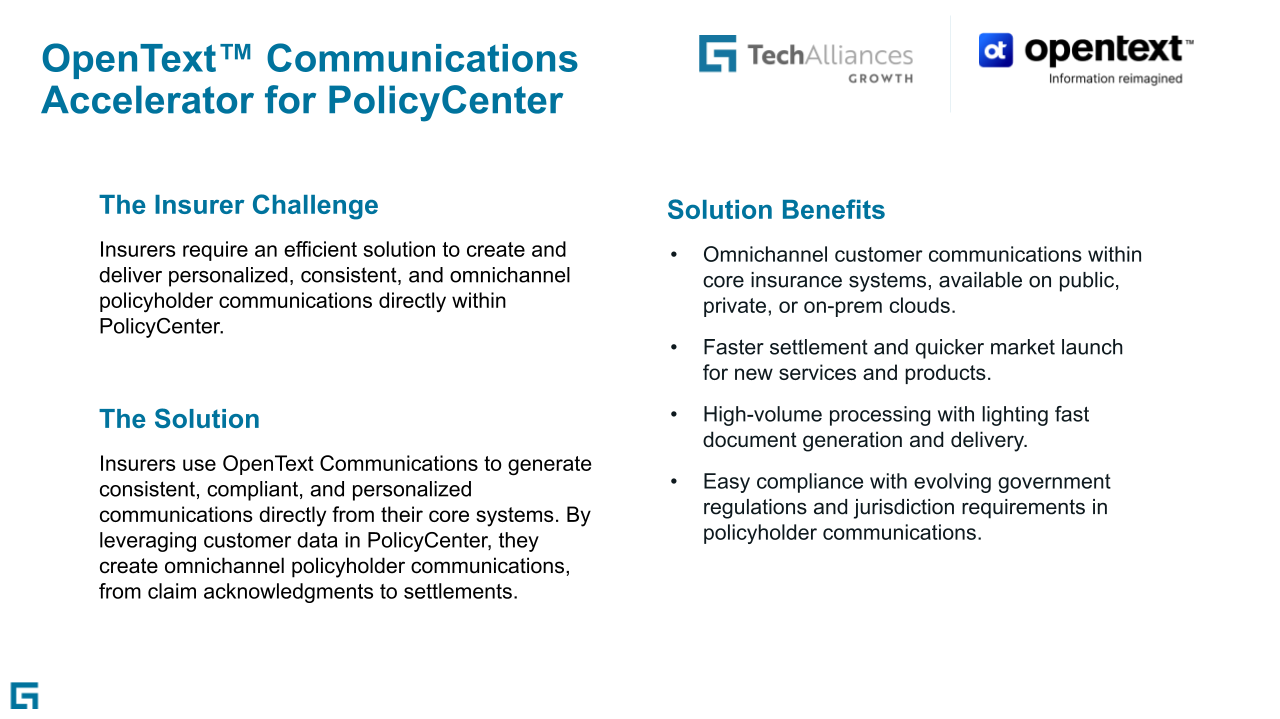 OpenText Communications to generate compliant, personalized policyholder communications directly from PolicyCenter with seamless integration to enhances customer engagement, and speeds up time to market.
