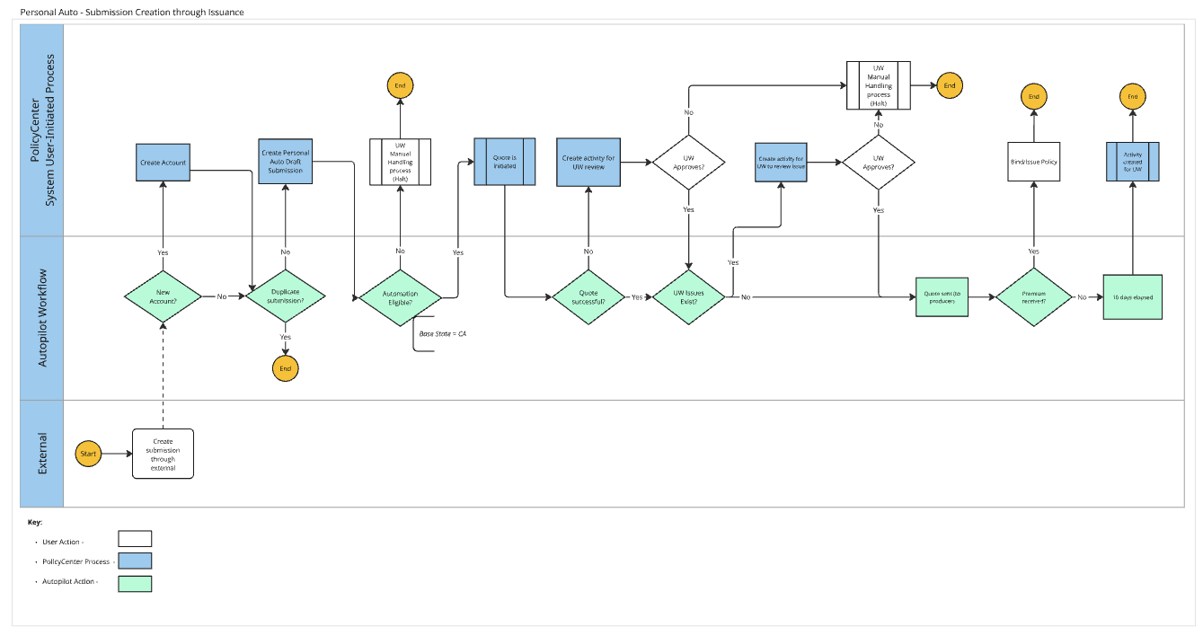 The Personal Auto Policy Submission Workflow Template fully automates the new submission process for the Personal Auto line of business (LOB) created using the USA Personal Auto Product Model, which can be downloaded from Guidewire Marketplace. This includes creating or searching an account, creating and quoting a submission, and issuing a policy.