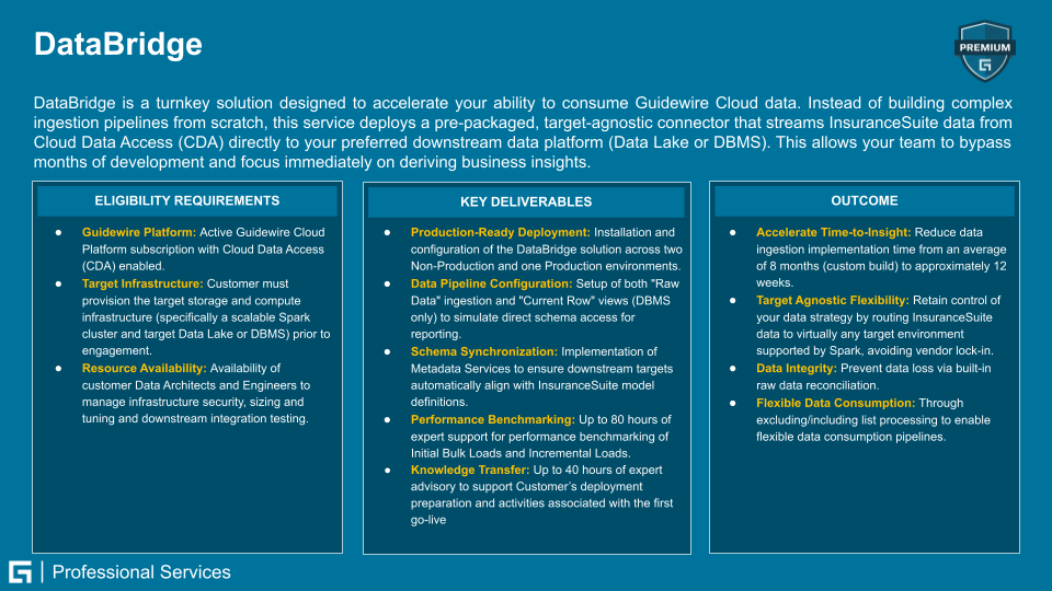 DataBridge is a Guidewire Professional Services offering. It is a platform agnostic CDA Data Ingestion process to load Data from GWCP S3 bucket to Customers' self managed target environment.