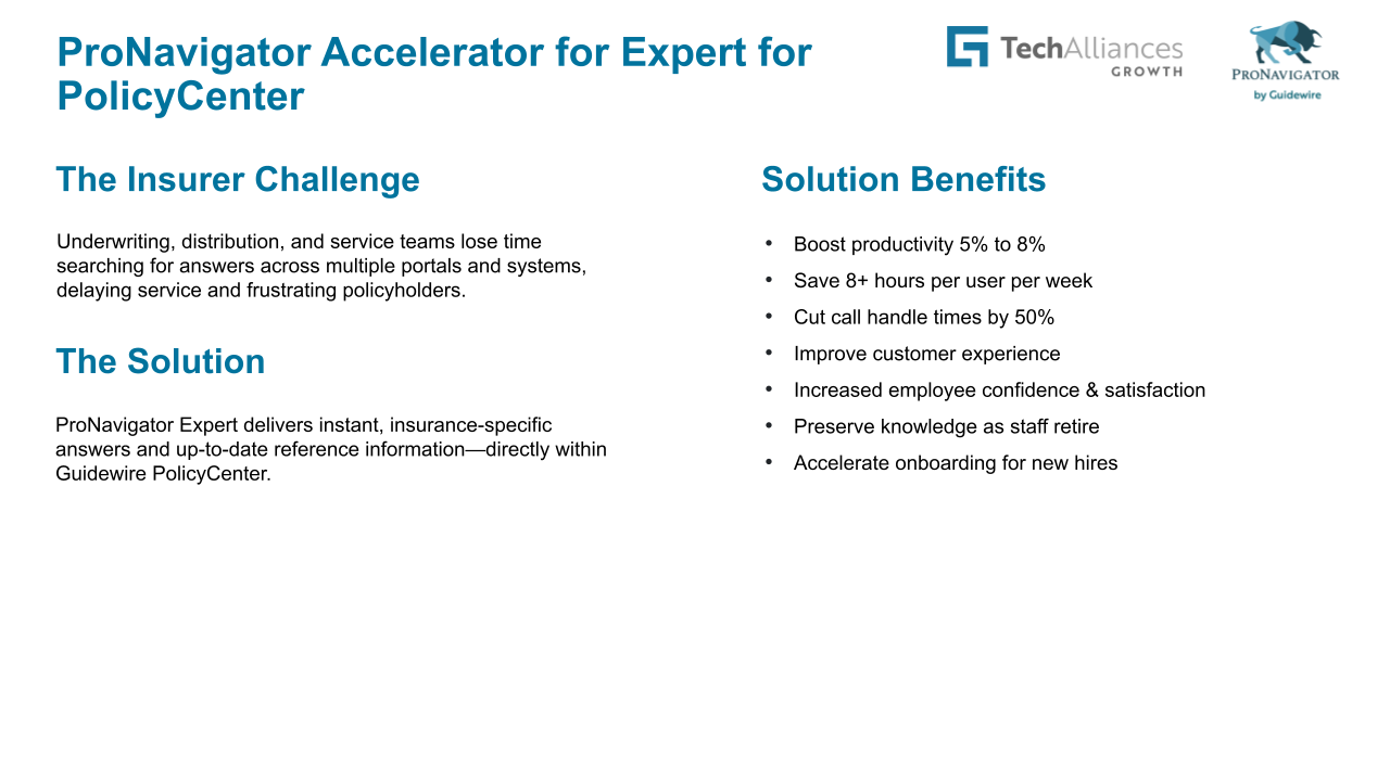 ProNavigator Expert delivers instant, insurance-specific answers and up-to-date reference information—directly within Guidewire PolicyCenter.