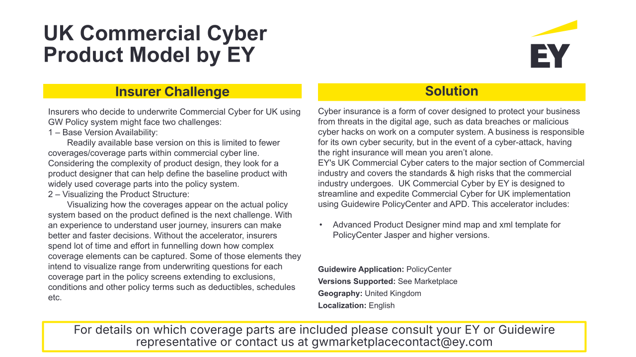 Cyber insurance line of business caters significant assistance with and management of cyber incidents both before and after an incident has occurred. UK Cyber by EY is designed to streamline and expedite cyber insurance implementation using Guidewire PolicyCenter and APD.