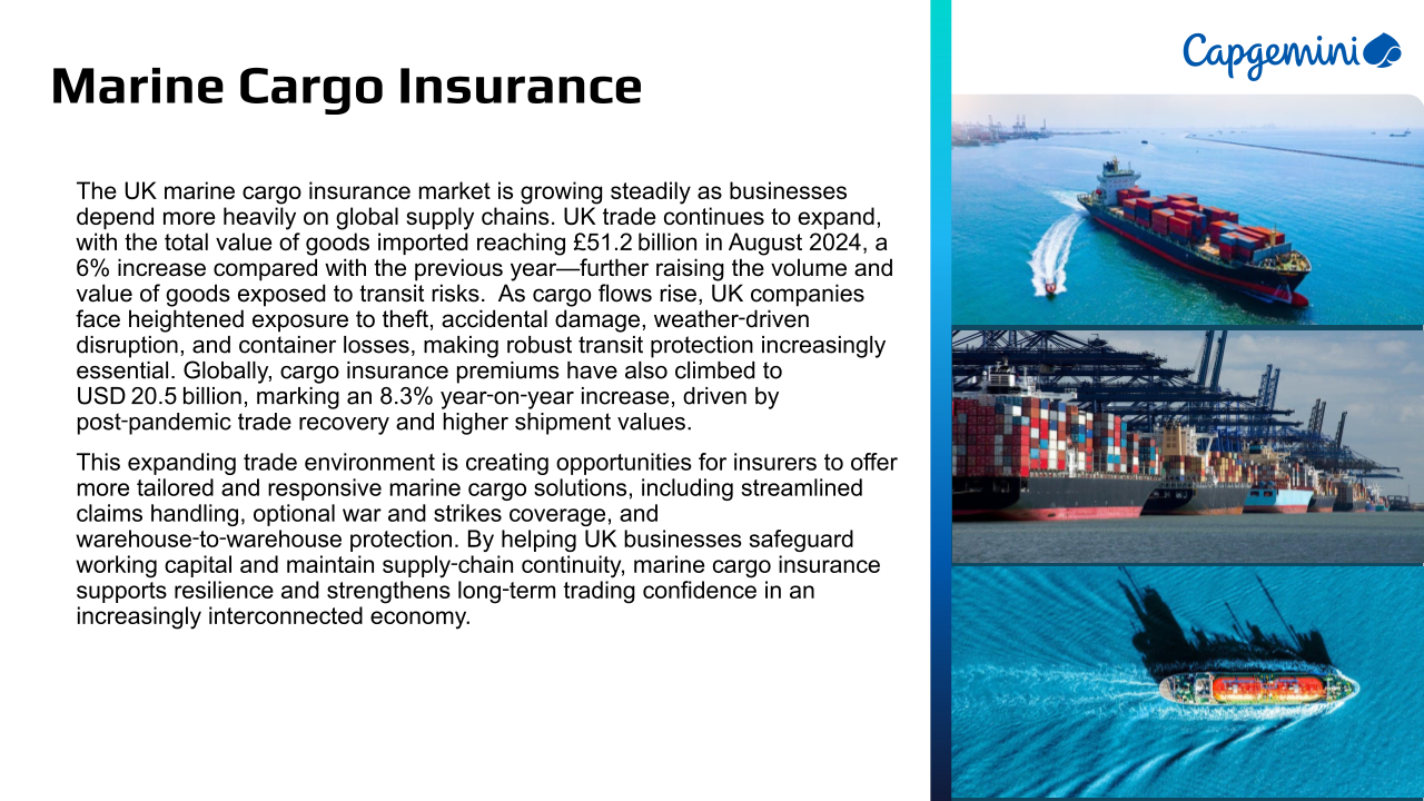 UK Marine Cargo Insurance protects goods in transit against loss, damage, or theft using industry‑standard Institute Cargo Clauses. It supports UK businesses moving goods domestically or internationally with dependable, configurable coverage now built with Integration Frameworks for Guidewire Cloud.