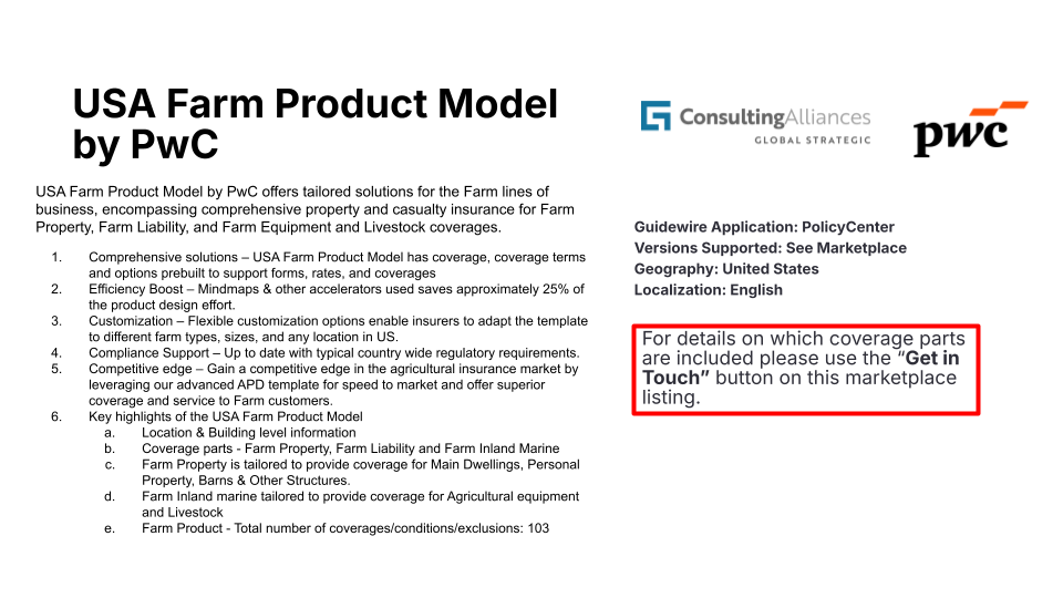 USA Farm Product Model by PwC offers tailored solutions for the Farm lines of business, encompassing comprehensive property and casualty insurance for Farm Property, Farm Liability, and Farm Equipment and Livestock overages.