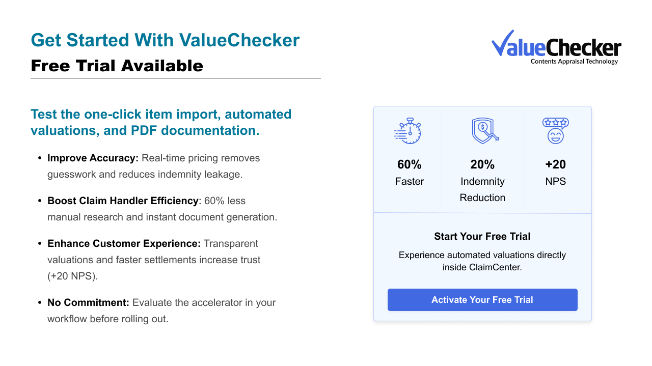 Integrate ValueChecker into ClaimCenter to drive Straight-Through Processing (STP) and save 60% handling time. Automate valuations, process BER lists, and use customer self-service portals to boost efficiency and reduce indemnity costs by 20%.