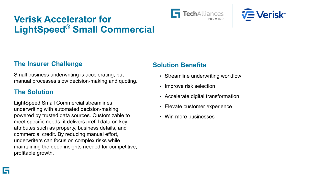Powered by innovation and bolstered by industry expertise and unmatched data and analytics, LightSpeed® Small Commercial enables automated underwriting without sacrificing the risk insights that help you compete and grow a profitable book of business.