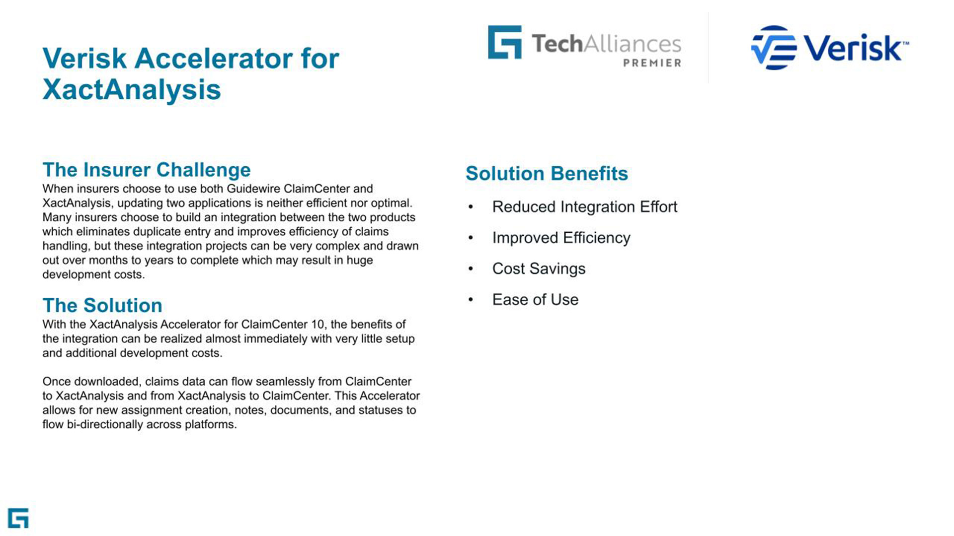The XactAnalysis Accelerator streamlines the integration between Guidewire ClaimCenter and XactAnalysis to enable the flow of claims data seamlessly from Guidewire ClaimCenter to XactAnalysis and from XactAnalysis to Guidewire ClaimCenter.