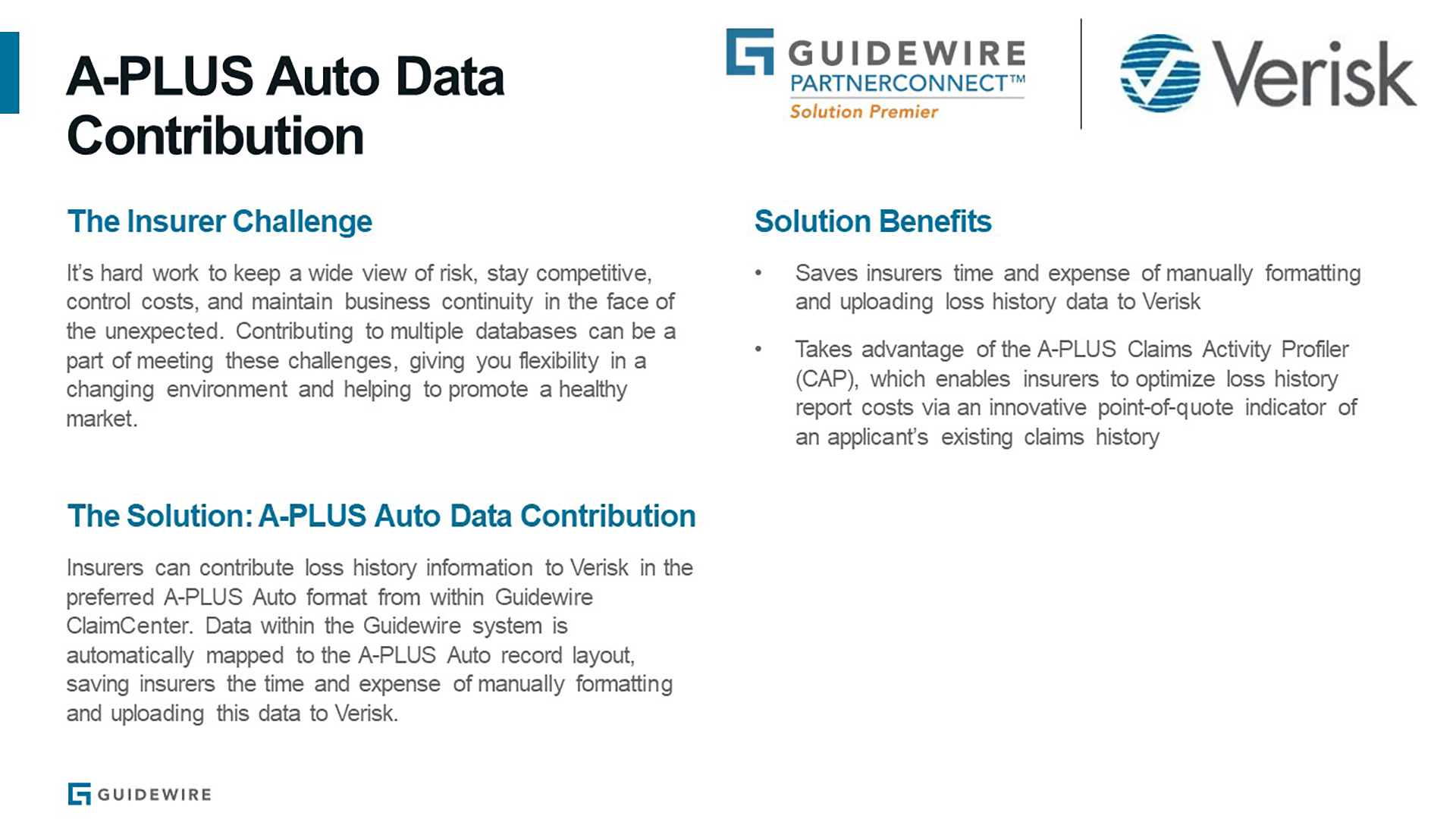 Verisk A-Plus Auto for Personal Lines Contribution Accelerator enables Guidewire ClaimCenter customers to streamline processes related to the submission of personal auto loss history data to Verisk.
