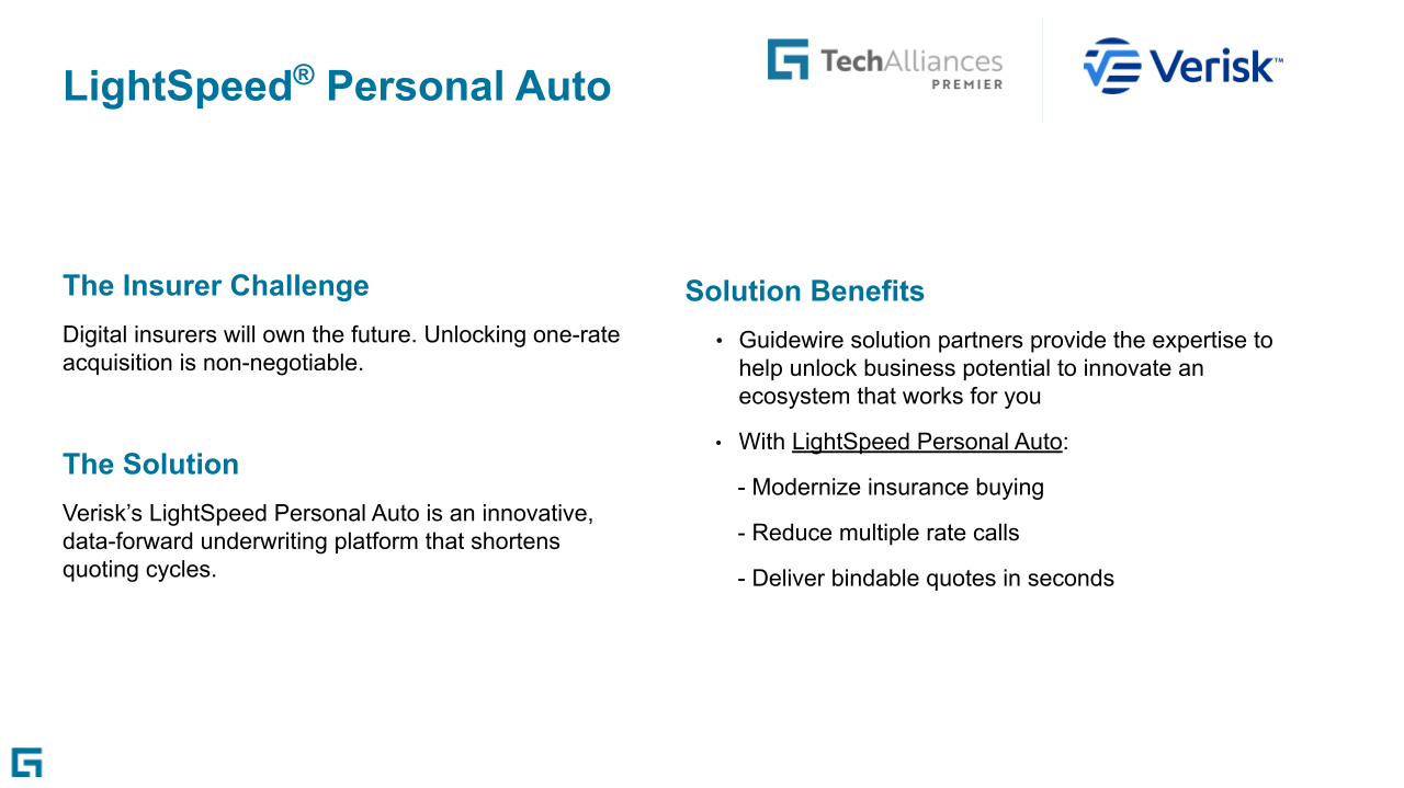 LightSpeed® Personal Auto is an innovative data-forward underwriting platform that shortens quoting cycles and enables insurers to modernize insurance buying experiences, reduce multiple rate calls, and deliver reliable, bindable quotes in seconds.